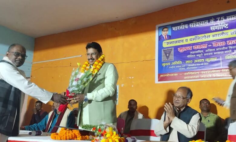 मगध हेडलाइंस: औरंगाबाद। ओबरा प्रखंड क्षेत्र के गौतम बुद्ध टाउन हॉल में भारतीय संविधान के 75 साल पूरे होने पर संगोष्ठी कार्यक्रम का आयोजन किया गया जिसमें राजद संसदीय दल के नेता सह औरंगाबाद सांसद अभय कुशवाहा एवं काराकाट सांसद राजाराम सिंह सहित कई अन्य प्रमुख रूप से मौजूद रहे। कार्यक्रम में सांसदों ने संविधान की विशेषताओं को बताया गया और बाबा साहब भीमराव अंबेडकर को याद किया गया। इस कार्यक्रम से पहले पदयात्रा निकली गई जिसमें संविधान बचाओ मार्च के दौरान खरांटी के शहिद जगतपति कुमार, संविधान निर्माता डॉ भीमराव अंबेडकर, पूर्व मुख्यमंत्री श्रीकृष्ण सिंह एवं बिहार लेलीन जगदेव प्रसाद के प्रतिमा पर माल्यार्पण किया गया। इस दौरान संविधान निर्माता डॉ अंबेडकर के खिलाफ मर्यादित भाषा को लेकर केंद्रीय गृह मंत्री अमित शाह के विरोध में लोगों ने नारेबाजी की।